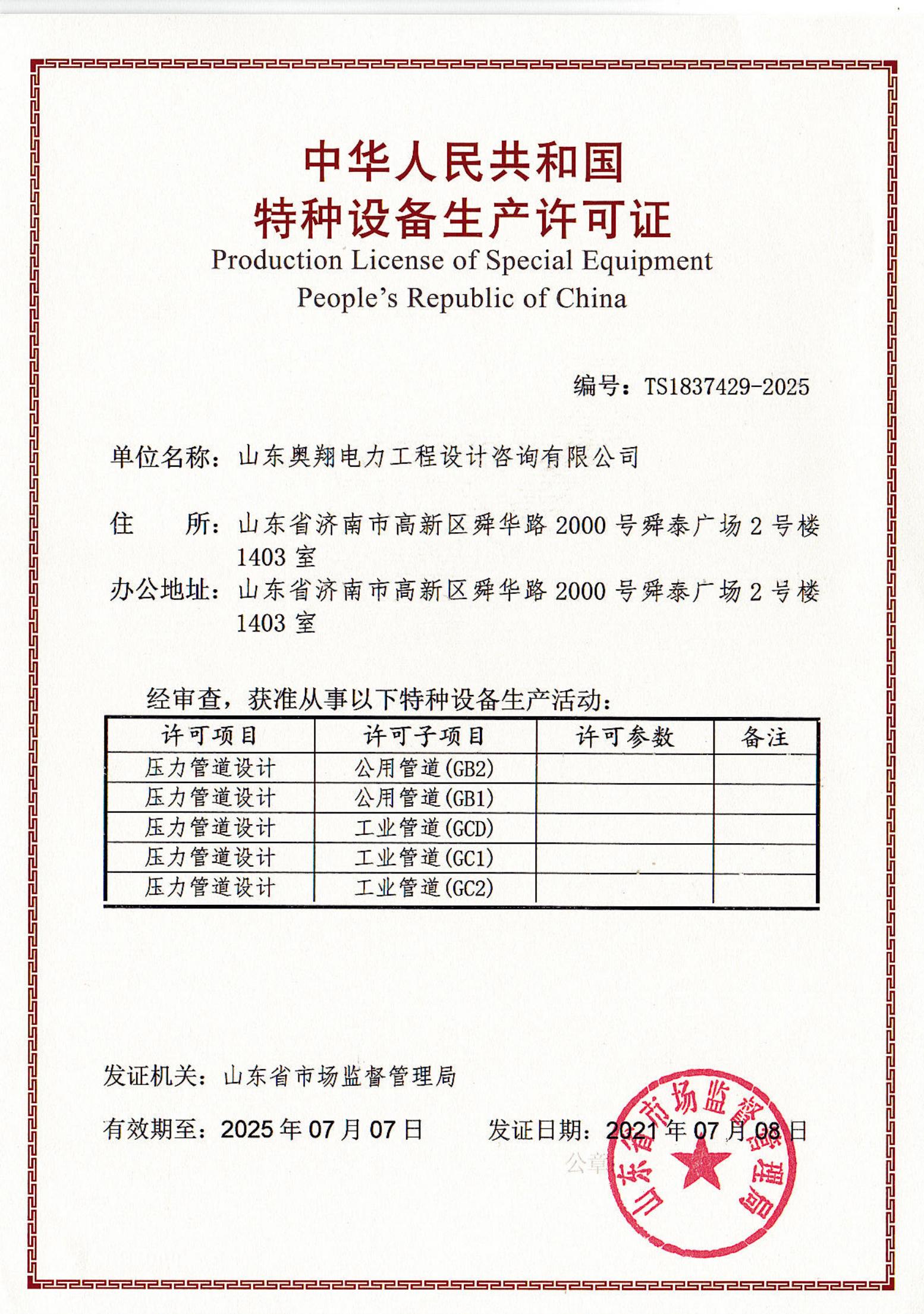 近日,在山東省市場監督管理局最終審核后,山東奧翔完成了特種設備設計許可證書換證工作,實現了GB1,GB2,GC1,GC2,GCD級別壓力管道設計特種設備許可證的延續。